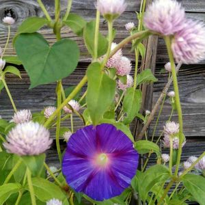 こんばんは〜 溢れ種の千日紅と白アサガオ (以前投稿した 朝顔) 畑にいっぱい広がってくれました💖 朝顔の蔓が伸びて😅💦 今年も晩秋迄🎶 すっかり秋ですねぇ〜 今日もお疲れ様です^ ^〜⭐︎