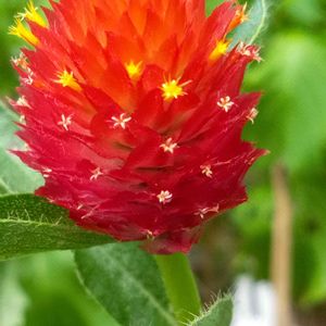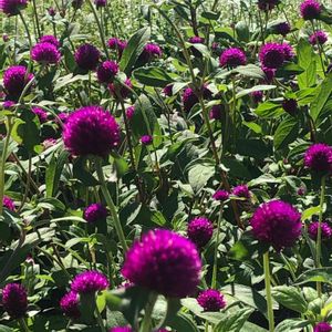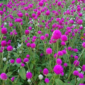 《一面の赤いボールのお花畑🌸》 この花は花そのものではなく紫やピンク、白、黄、赤に色づく「苞」を観賞します。暑さと乾燥に強く、日本の夏に適した性質で、長期間咲き続けます。庭や花壇、鉢に植えて育てたものが、切り花としてよく仏壇に飾られます。また、フラワーアレンジメントにも欠かせない素材です。苞の部分はドライフラワーにしても色があせにくいため、名前のとおり、千日色が変わらないのではないかと思うほどです🤗🌸 「君の名は」