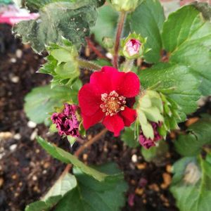🍓毎月15日はいちごの日🍓 投稿させてください 上はローズベリーレッド 下左は 楽なりイチゴ どちらも楽しめました 甘くはなかったけど💦🥴 ローズベリーは 確かに花が葉の間から見えて綺麗でした あまりに葉が出てくるので かなり 剪定?取り除き なお シクラメンの葉のように 花に日が当たるように 葉を絡めてました 実も たくさん着きすぎるので 選別 下右は え~〰️〰️ーっと〰️〰️💦🥴