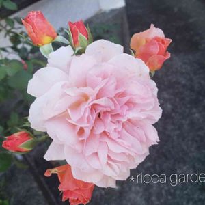 何日か前のかおりかざりさん🌹 蕾はオレンジ、(だいぶ)咲き進むと薄ピンクになります。 その中間の色が代表色…かな?