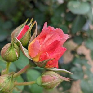 🌹 和バラ『かおりかざり』 名前の由来は「香りを飾る」のコンセプトから… 花持ちもよく、南国フルーツ🥭の甘い香りです🎵 部屋で楽しむバラとしてもおすすめです。 咲き始めは濃いオレンジ色でやがてパステル調のオレンジへと変化も楽しめます。