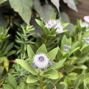 【グロブラリア・ブルーアイ(ルリカンザシ、目玉のおやじ)】 カナリア諸島原産、オオバコ科常緑~半常緑低木 直径2cmほどの瑠璃色の目のような玉状の花で、咲き進むにつれて白目の部分が増えていく。 グロブラリアとはラテン語で「小さく丸い頭」を意味する。 以前は「目玉のおやじ」の愛称で流通していた。 樹高:30~50 cm 花期:5月~10月 花色:青紫・白 ガーデンマルシェ防府にて
