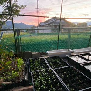 ポット苗をそろそろܾ ܾ 𖥧𓇣𖦥𖥧𖥣植えられるかな〜と眺めて❤︎.* 左手キンセンカ間引かないと駄目だな~ 右手はメダカ🐟チラットしか写って無いが結構置いてあり… 花が押されてます💦 今日は夕焼けが広範囲で綺麗・.。*・.🙌