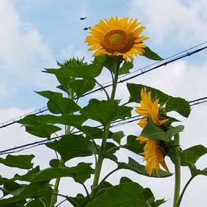 今朝の散歩で向日葵畑を発見🌻🌻🌻🌻🌻 見事に背の高い向日葵が畑一面に咲いてました😄 今気がついたんですが、向日葵の左側2つ何か飛んでる??? 飛行機?ヘリコプター?虫かな?
