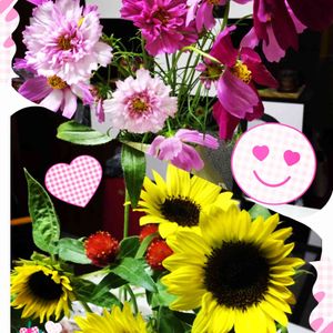 優しさ(ピンク色)と元気(黄色、赤)が欲しくて切花を飾りました🥰