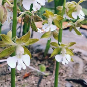エビネが咲きました🌼🎵 貰い物を家の裏の砂利が敷いてあるような所に適当に植えて(^^;ゞ、花期以外は殆ど忘れている存在なのに、ちゃんと咲いてくれてありがとう💕 地味かも知れませんが、清楚で気品もあります✨もっと大事にしてあげないと、と思います☺ カラフルな園芸種には見られない素朴さ・・・原種かな?ジエビネが1番近いのでは、と思いますが、詳しい方がいらしたら、教えて下さい。調べたら、絶滅危惧Ⅱ類?!🙀そんな貴重な植物??本当ならば殖やして山野に返してあげたいですが・・・ それにしても、花が咲いた途端に倒れてフニャフニャして、どうしたんだろうと思ったら、花が咲いて強い太陽光が当たると、そっちに倒れる性質があるそうです。ここは朝日はしっかり当たるので、どうりで東側に倒れています😅よいしょ、と立たせて撮りました💓 ラン科カランセ(エビネ)属🌿 花言葉:謙虚・謙虚な恋 白い花:誠実・清廉