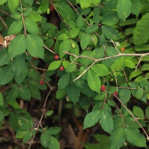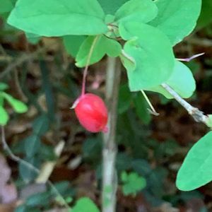 林の中の小川沿に、水面上に垂れ下がるように枝が伸びています。 鮮やかな葉の色で、前からずっと気になっていたんですが、赤い実がさくらんぼみたいに対になって付き始めています。 →ウグイスカグラ(鶯神楽)だと教えて頂きました♪