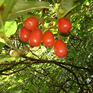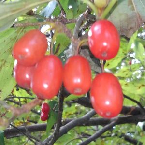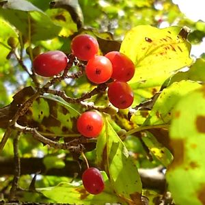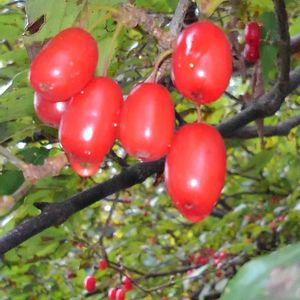 お散歩中に見た果実(樹木)たち… サンシュユ(山茱萸) コナシ(小梨)×2=ズミ/コリンゴ リキュウバイ(利休梅) ハクウンボク(白雲木) ⚫︎⚪︎⚪︎⚪︎⚪︎