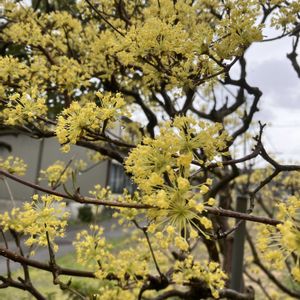 サンシュユ 今日は友人宅で誕生日会❗️ 雨に濡れても明るく咲いてます😃