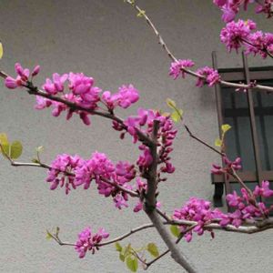 ご近所のフェンスから、 ハナズオウの花が、覗いて、「綺麗でしょ、見て❗」と声をかけられたような、気がしました。