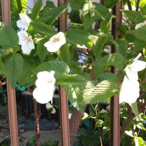 散策の帰り道に、近所のお宅のフェンスに、白い山吹の花が、咲いてました。