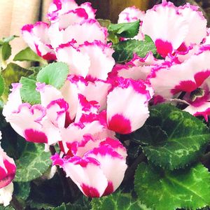 今日の窓辺はポッカポカでしたので☀️🪟暖かい陽射しを浴びた葉っぱさんたちが好きずきにあちらこちらと伸び出して🌱立ち位置⁇咲き位置⁇に困ってるご様子のフリフリシクラメンさんたちでした😅💦