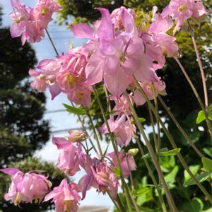 庭のピンクのオダマキが満開です。 青い空にピンクの花が映えます。
