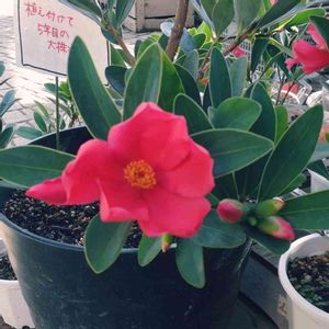 暑い店頭で鮮やかな花を咲かせている『アザレアツバキ』。 夏から秋に花を咲かせ続けてくれます。 松本の冬の寒さには耐えられなので、冬は室内で育てないといけないのが残念なところ。