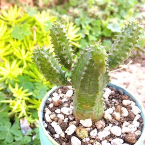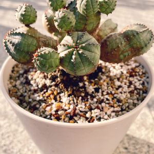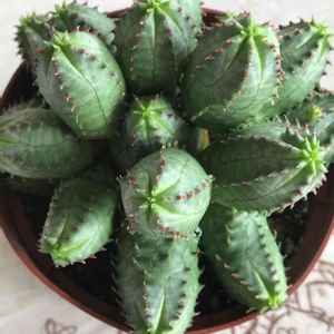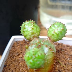 ユーフォルビア オベサブロウ か、可愛い🥰💞 子株が2つ付いてるのを見て、手をあげてるように見えたのがユーフォルビアが気になりだしたキッカケ😁 でも欲張って子株が4つ付いてる子をお迎えしました❤️