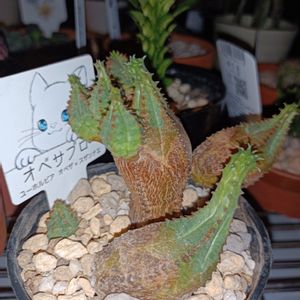 オベサブロウ ポイント消化に購入しました♪ 段ボールの中で乱舞したのか鉢から抜けて土まみれ💦子株も一つ千切れていました🥶 被った土を筆で払い、鉢に土を戻して千切れた子株は土に乗せておくことにしました!