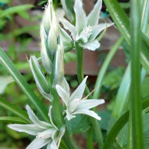 秋植え球根のオーニソガラムヌタンスの花が下の方から少しずつ咲いてきました😆 白い花びらの裏の緑色が表に透けて見えるのか緑にもグレーにも見える印象的なお花💕 ガラスの花と言われてるそうで~
