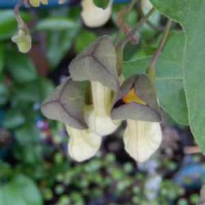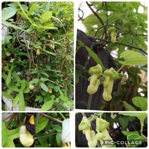アリマウマノスズクサ 毎年花を付けてくれますが今年はいつもよりお花を沢山付けてくれてます。 右が青軸素心です。 変な形のお花ですがお気に入りのお花で私は素心の方が美しいと思っています。