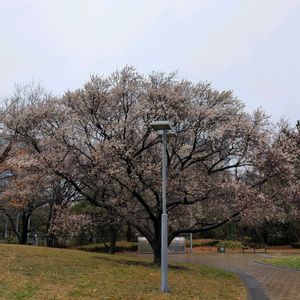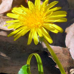 曇りのち晴れ、午後は風が吹いて寒くなりました。 日があたる散歩道。 落ち葉が敷き詰められる中に たんぽぽの花が咲いていました