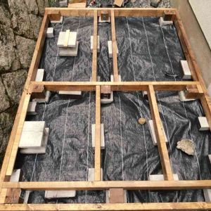 裏庭素敵化計画④ 床下地を作る できるだけギシギシ言わないようにした! 所々水平じゃないとこもあるようなないような… 素人DIYだからしかたないか😅