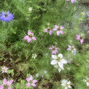 おはようございます〜😄 今日も、畑の一角にある宿根草エリア内のお花さん達を見てください〜😆💞💠 ①コレオプシス ソーラームーン🤍💛 ②リナリアと蝶🤍🩷 ③ジギタリス🤍🩷 ④ニゲラ🩵💙 ⑤pwフロックス オープニングアクト   ピンクアドットとロマンス🤍🩷    かわいいコレオプシスさんを購入しました〜💛💛 宿根リナリアさんは高さ1m程あり、風に揺れてかわいい〜🤍🩷 モンシロチョウさん、中々飛び立ちませんでした〜🤭🎉 ジギタリスさん、お隣の花友さんからの頂きものです〜🤍🩷 綺麗に咲いてくれて嬉しいです〜🤍🩷 ①〜③のバックはリシマキアオーレアで、ここに植えた覚えはなく、ポイポイしたものがいつの間にか広がって〜💛💛 とても綺麗です〜💛💛 ニゲラさんは、とても綺麗に咲いてくれているので再登場です〜🩵💙💙 pwさんのフロックス咲きだしました〜🤍🩷 この2種は、今年購入です〜🤭🎉 昨年購入のウルトラピンクは、そろそろ咲きますね~🩷🩷 ニゲラさんだけは宿根草ではありませんが、何故かこの季節はここの主役のようです〜🩵💙💙 いい時期ですね〜、この位の気温でいて欲しいけれど、夏はお花にとっても私にとっても過酷です~😭💨