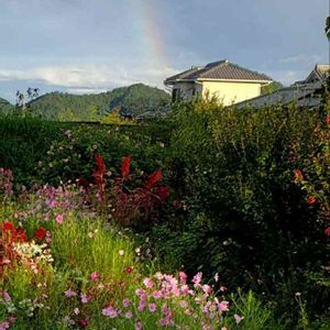こんばんわ。 夕立のあと虹がでました。 花友さんちのお花畑。コスモス、鶏頭などきれいです。