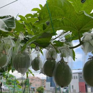 いよいよパッションフルーツの収穫が始まりました☺️ 熟すと自然落下するとのことで,袋掛けをして有ります 左中央は落下前 左下は自然落下した物 右下が収穫したパッションフルーツです☺️ 追熟してから食べようと思います😄