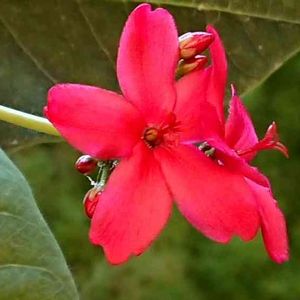 ヤトロファ・インテゲリマの真っ赤な花 サクラの花色を鮮やかにした感じなので 南洋桜(ナンヨウザクラ)の和名がついています 花言葉:「優れた美人」 燃えるような赤🏷のコラボに参加しています