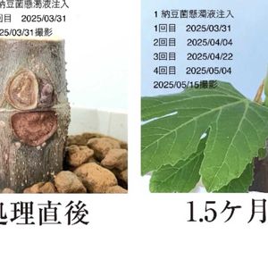 SNSでイチジクを始めとした果樹や野菜などの栽培に納豆菌を利用した事例が見受けられます 納豆菌を培養してこれを希釈して用いる方法や納豆菌を培養することなく、水に懸濁したものを用いる方法があるようです 今回、納豆菌を培養することなく、水に懸濁したものをイチジク穂木を挿し木した用土に注入するとどうなるのか調べてみました その結果、処理1ヶ月後に納豆菌懸濁液を注入したすべての穂木で発芽が認められました 一方、対照の水だけを注入した穂木はまだ発芽しておりません 供試イチジク品種:「桝井ドーフィン」の穂木5本を用いました 挿し木用土:赤玉土中粒と市販のプランター培養土を2:1に混和したものを使用しました 納豆菌懸濁液の作製:1パックの市販の納豆を50回かき混ぜてから納豆は別の容器に移し、納豆のパックに残ったネバネバを1LのRO水に懸濁して使用しました 挿し木と納豆菌懸濁液の処理:容器の底に赤玉土中粒を敷き、適当量の用土を入れてから穂木を置き、この周りに用土を詰めてから赤玉土中粒を覆土しました 3本の穂木の用土に納豆菌懸濁液をそれぞれ容器の底から流れ出るまで注入しました 対照として2本の穂木の用土には、水道水を同様に注入しました(2025/03/31) 用土の表面が乾いて来たら納豆菌懸濁液と対照の水道水をそれぞれ追加して注入しました 納豆菌懸濁液と水道水をそれぞれ注入した時期は次の通りです 1回目注入 2025/03/31 2回目注入 2025/04/04 3回目注入 2025/04/22 処理した容器は室内に置いて、置き場所が穂木の発芽に影響しない様にそれぞれの容器の置き場所を少しずつ円を描く様に毎日1回ずらしました