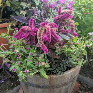 今朝も暑いのに今頃水やり。 これで早朝の仕事に行けるのか疑問。 昨日買ってきたお買い得フラワーとかいろいろ寄せ植えして玄関前に飾りました。 レウコフィルム、セロシア2つ、センニチコウチナツ3つ、ダークなリーフの植物3つ、なぜか後ろにパープルのトラディスカンチアを土に挿して完成。 どこかでハロウィンの飾りを、調達してこようかな。 あまりの暑さに白く咲いてたガーベラは、サーモンでした。 グリーンアイス、サンショウバラも、復活してきました。 さて、大きな種まき 発芽するかな。