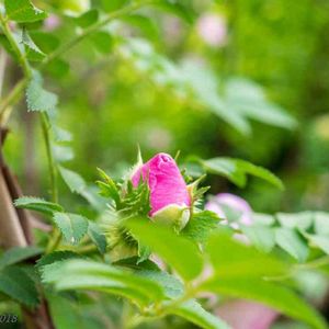 2018.4.30 県立相模原公園にて こちらは箱根バラのつぼみです。ピンクが濃いですね(^^; 葉っぱが山椒ににてるからサンショウバラと言われるそうです。