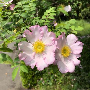 こんばんは😄 初めて出会いました👍山椒薔薇🌹 山梨 西湖いやしの里にて