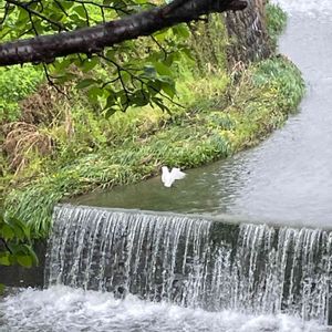 昨日の朝 すごい雷雨⚡️☔️で いつもの川が増水していました。 しばらく川の中を見ていた シラサギさん 飛びましたー🕊