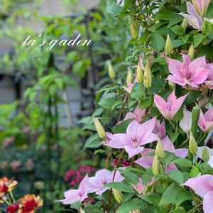2投目失礼します🎶 "クレマチス ピンクファンタジー" 2年目です 可愛いさたまりませーん💕 蕾もたくさん😍 左下には"ラックスハデス"もまだまだ派手に咲いてまーす(*´∀`)♪