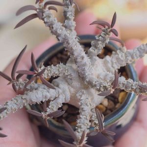 なつかしのシリーズ 01.02.03. ハナキリンの近似種ゴットレベイ これ、何年くらい前だろう(2019年だった)…石井ナーセリーさんで見つけて飛びついたやつ。 今は咲いていませんが春先に黄色い花を咲かせます。細い葉っぱもよいですね。 普通のは赤花で結構大きくなるのだけど、この株は小さいまま。それもかわいい。 最近お気に入りのプラ鉢に植え替えしました。 04. GSの表紙を飾ったこともあるステファニア・スベローサ。こちらもサイズ変わらず。 夏はツル系の塊根植物が涼しげでいいですね。