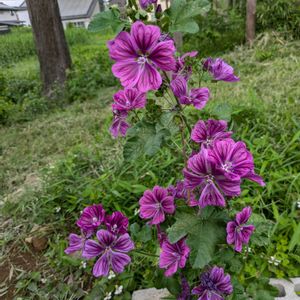 今日のお花 ウスベニアオイ またの名をブルーマロウ🌸 今年も空高く既に2.5mはあろうかと。。。 一株手前から奥まで1mはあろうかと。。。