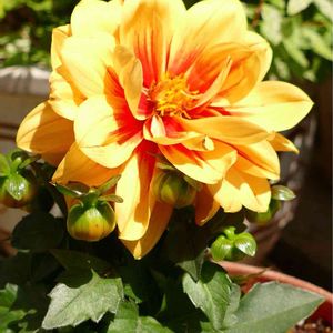 「ダリア」✨🌼 お迎えした1番花が咲きました❣️😊 太陽の光を浴びて踊っているような表情で元気をもらいました💃💪😆 キク科・ダリア属 別名 :「テンジクボタン(天竺牡丹)」 花言葉 :「華麗」「気品」「優雅」 「移り気」「裏切り」「不安定」