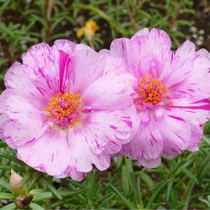 今日のお花「マツバボタン(松葉牡丹)」 ✨🌸 今年も素敵な絞りの花に出会えました✨❣️😄 毎年、採取した種で育てているとのことです。 他にピンク、黄色、オレンジなど沢山ありましたが、段々と黄色が多くなっているとのことでした🌼🌼🌸🤔 スベリヒユ科スベリヒユ属 別名 :「ツメキリソウ(爪切草)」 「ヒデリソウ(日照草)」 花言葉 :「無邪気」「可憐」