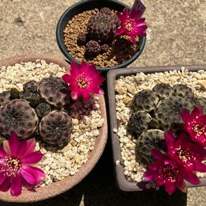 土日の植替え。 ①ギムノは、 水耕栽培してたの2つ 鉢パンパンのモノ オバチャンがマリオの🐢蹴るごときにやって、植替えせざるを得なくなったモノ ②鉢パンパンの3つ そこからもげたモノ お迎えした2つ ③④お迎えした地固め鉢 マミラリア のカギ棘だから、高砂かなぁ(´╯σ ╰`)? 密かに赤い蕾らしきモノが見えているから、咲いたら嬉しいなぁ꒰*´艸`*꒱ ⑤お迎えしたダイソー 根っこ付近が曲がってるから、鉢の真ん中には、植えられなかったー(≧w≦;)