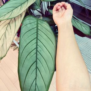 訪ねて行った伯父の家に 私の肩くらいまである巨大な…なにこれ? カラテア??? おじちゃん! めちゃめちゃカッコいいんですけど! クテナンテ・セトサ カラテアじゃないけど同じクズウコン科 近種なんだね、似てるわけだ 次、上から撮ったのアップします