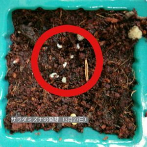 サラダミズナの発芽 3月23日に種子を蒔いた苗床に発芽を確認しました。 赤〇の部分です。