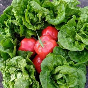 今朝の野菜の収穫 ミニッコレタスとパプリカ おまけに、レタスの中からバッタ登場🎉🎊