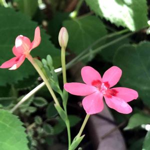 白とコーラルピンクの小さな花がひっそり咲いていました。同じ種類の色違いでしょうか?