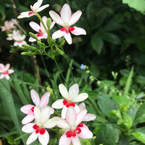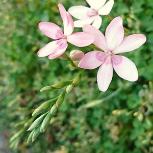 お隣の玄関ポストの下の花壇に咲いている “ヒメヒオウギ” アヤメ科フリージア属 原産地 南アフリカ、ケープ地方 同じアヤメ科のフリージアをぐっと小さくしたような花です。 紅色の斑紋が印象的。