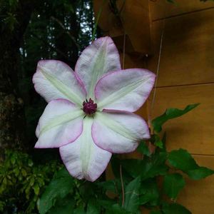 物置小屋の左の端っこで咲いているクレマチス🌼 名前が分からなくなってしまいましたが、ピンクの縁取りが可愛らしい子です😌💓