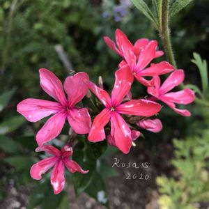 ❤️フロックス クレオパトラ💖 レッド系かと思っていましたが、とても可愛らしいピンク系のお花でした❣️ 花びらは星型、半八重咲きらしいですが、 もう少し先進むとハッキリしてくるのでしょうね。 💜サルビア ミスティックスパイヤーズブルー💜 フロックスの後ろに背高く咲いています。 一本だけコラボできました❣️ 朝から眩しい日差しが出てます☀️ 東北、関東の方から梅雨明けしましたね。 東北北部が近畿、四国よりも早い梅雨明けは24年ぶりとか‼️ こちらもそろそろ梅雨明けかなぁ⁈