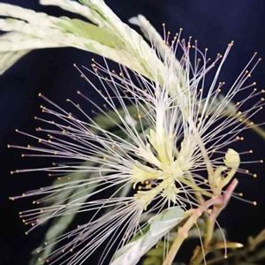 白斑入り合歓木 何の前触れもなく突然の開花(^^)💦 不思議なことに 色味はほとんど感じられない。 ほぼ白で 見過ごすところだった(笑) 優しく香る合歓の花😊♥️