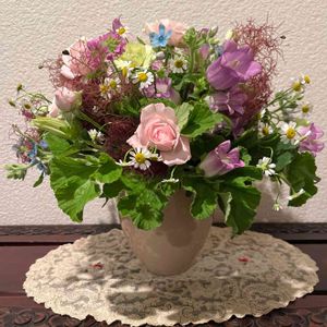 フラワーアレンジメント 月1のレッスンは沢山の花と触れ合う癒しの時間です。 ゼラニウム 、スプレーバラ、マトリカリア、カンパニュラ、スプレーカーネーション、スモークツリー、ブルースター 基本のドームアレンジメント。 モフモフのスモークツリーがいいアクセントです。