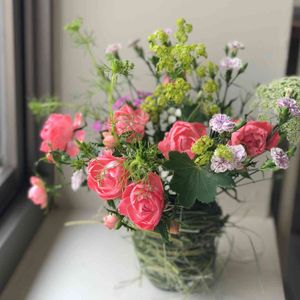 フラワーアレンジ💐 教室に参加しました♪ 6月のテーマは「小花ばかりで」 ベースはプラカップにニューサイランを割いたものを 巻きつけて作成。 枯れて行くのもイイ感じ、になる予定。 ○花材 ・グリーンミスト ・スプレーバラ ・ハマナデシコ ・カーネーション ・アルケミラモリス 🏷19日はピンクの日♪