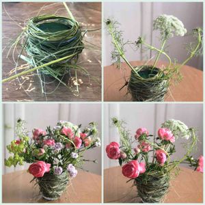 フラワーアレンジ💐作り方 左上から時計回りに ○オアシスを入れたプラカップにニューサイランを割いたものを巻きつけ、ベースに。 ○グリーンミスト(レースフラワー)を3〜4枝に分け、アウトラインに挿す。 花の向きは下を向かないように。 ○スプレーバラ(主花)を3〜4枝に分け、アウトライン内側に空間を均等に埋めるように。 ○アルケミラモリス(アクセント花)の位置を決めた後、添花たちを高低差をつけて。 今回は低い位置にハマナデシコ、主花と同じくらいにミニカーネーション。